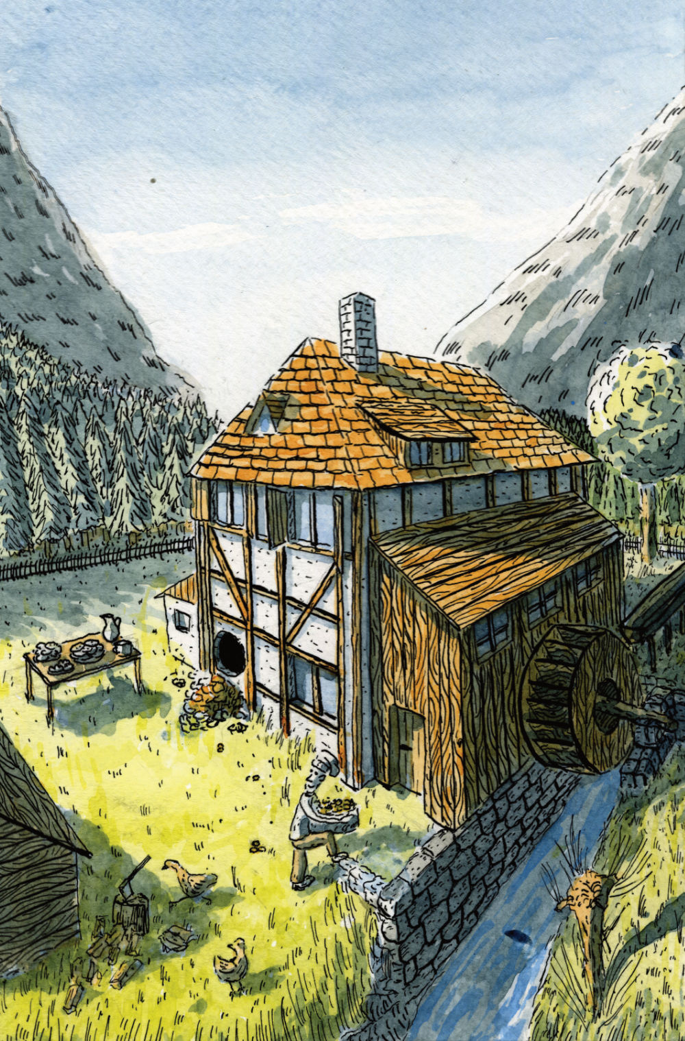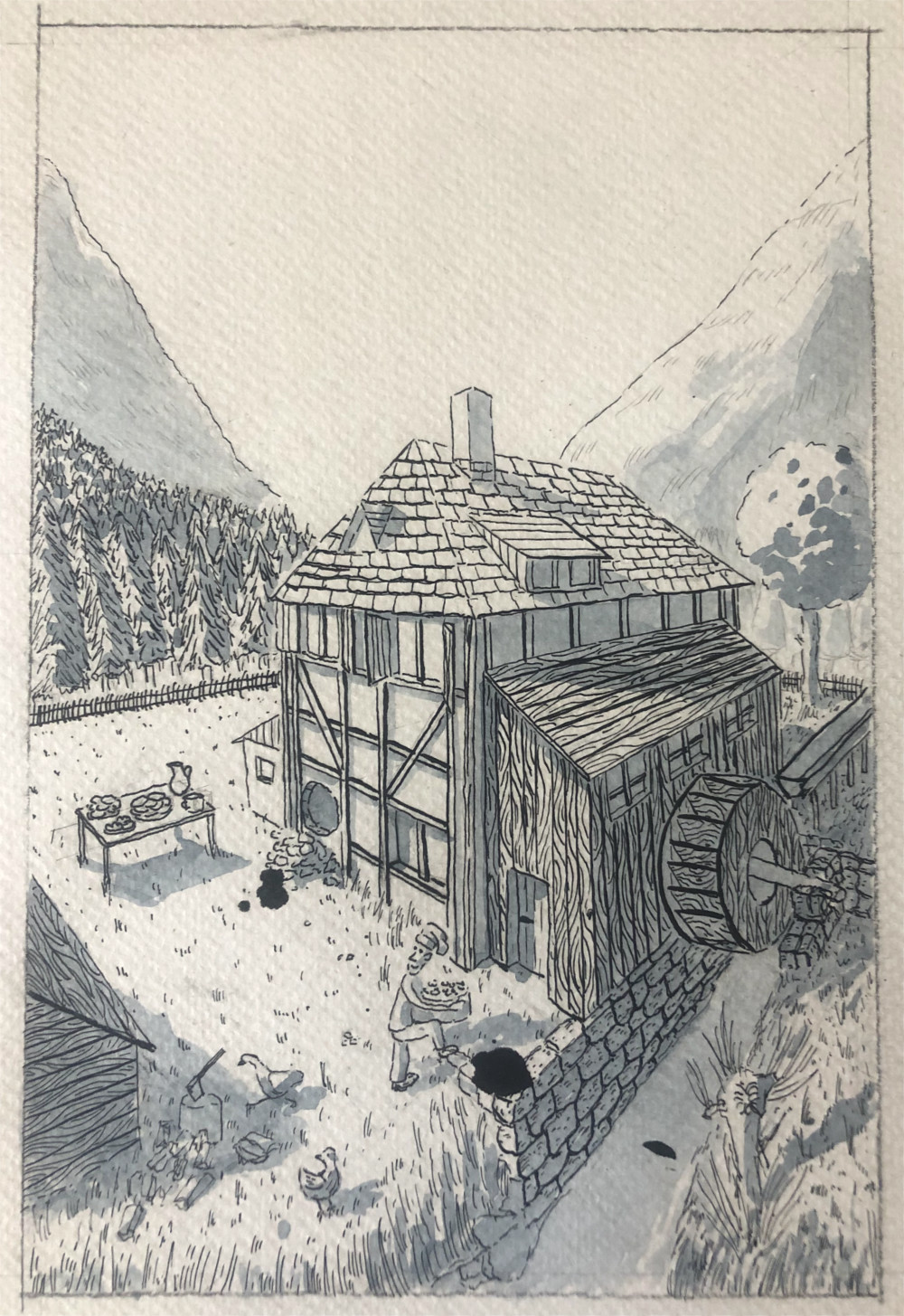 Akvarel a tuš.